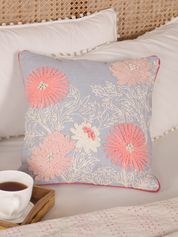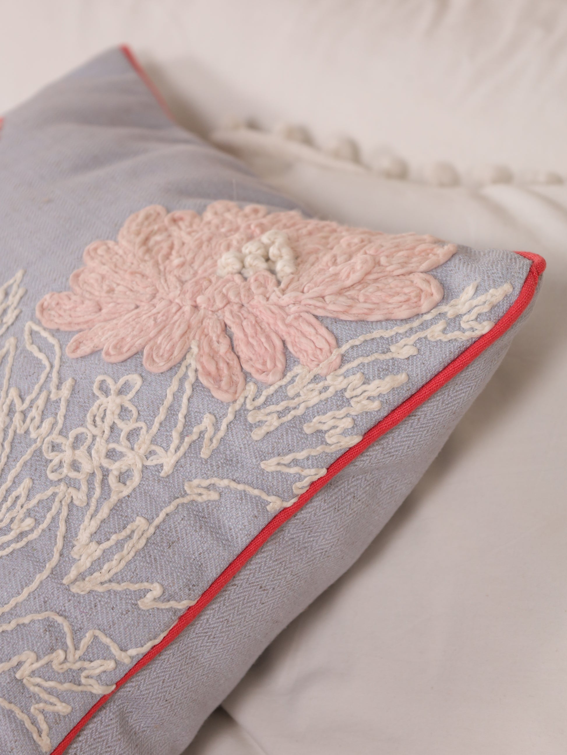 Add a splash of charm to your space with this big floral embroidered cushion cover with beautiful red pippin.