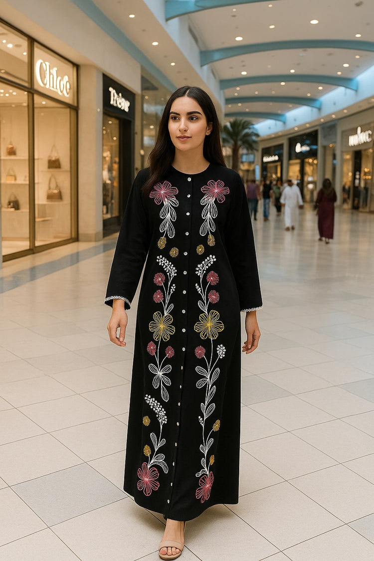 Black floral embordered A-Line closed neckline dress