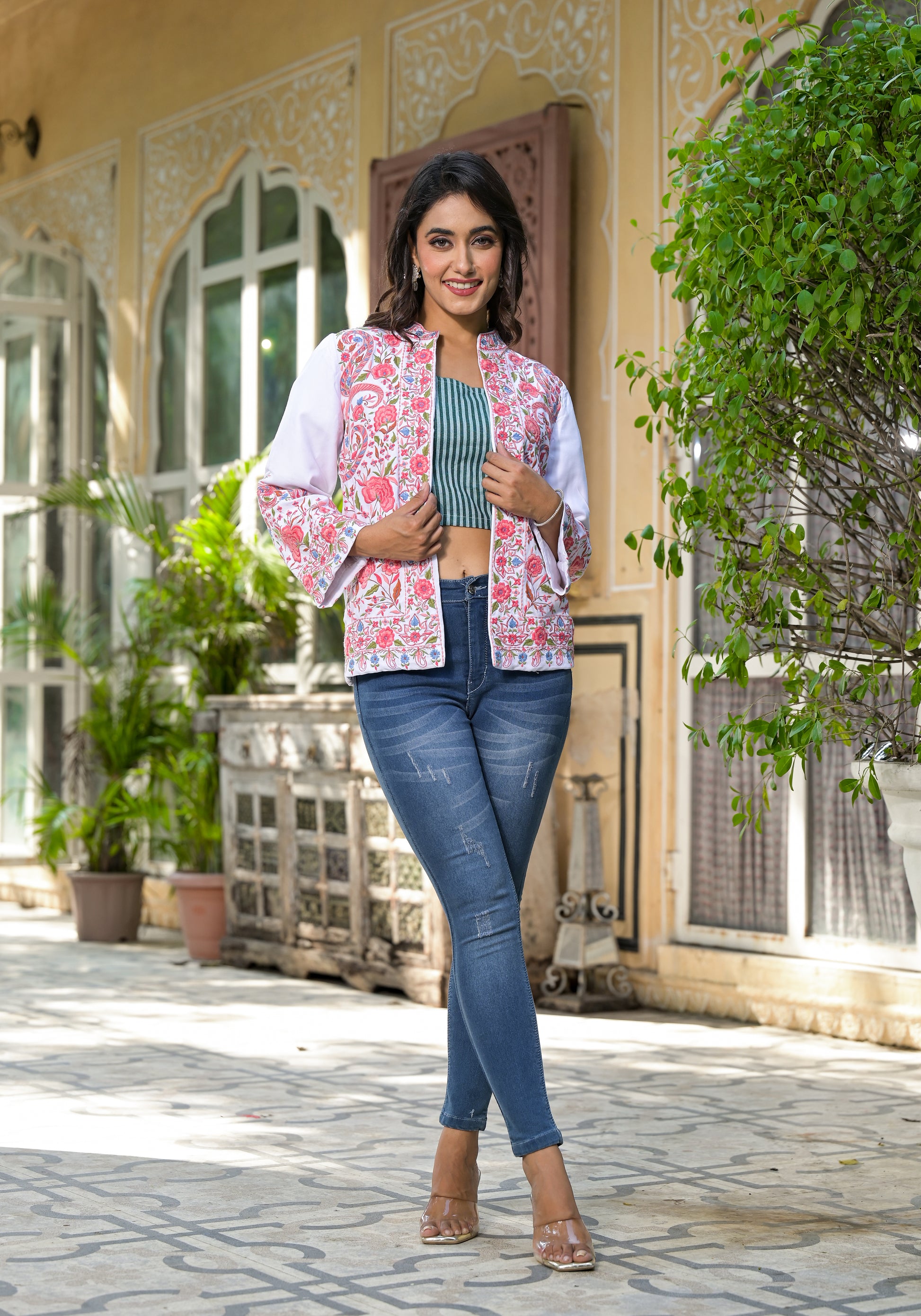 Brighten your style with the Chick Pink Embroidered White Jacket! This lively jacket features delicate pink embroidery on a crisp white canvas, adding a fun and fresh twist to your outfit. Perfect for those who love a playful pop of color while staying effortlessly chic.