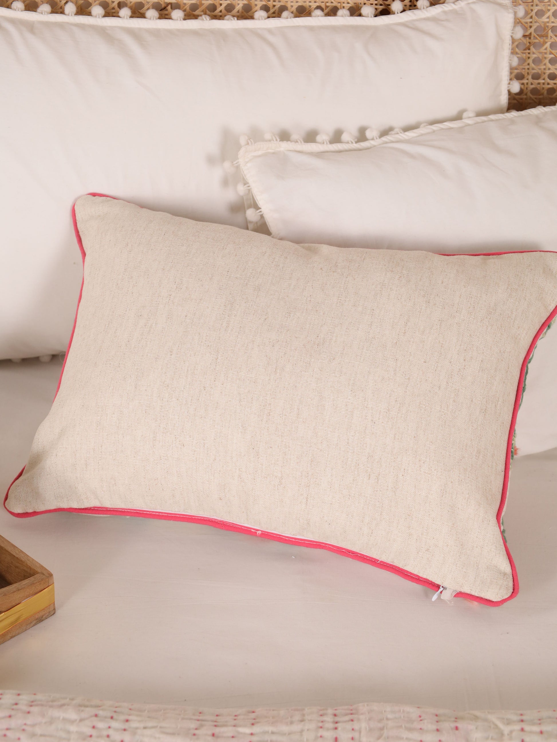 Add a splash of charm to your space with this Lotus embroidered cushion cover with beautiful pink pippin.