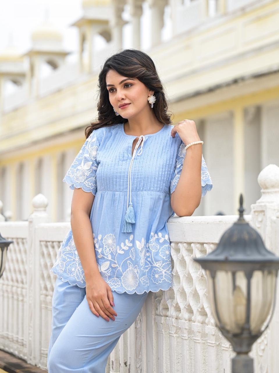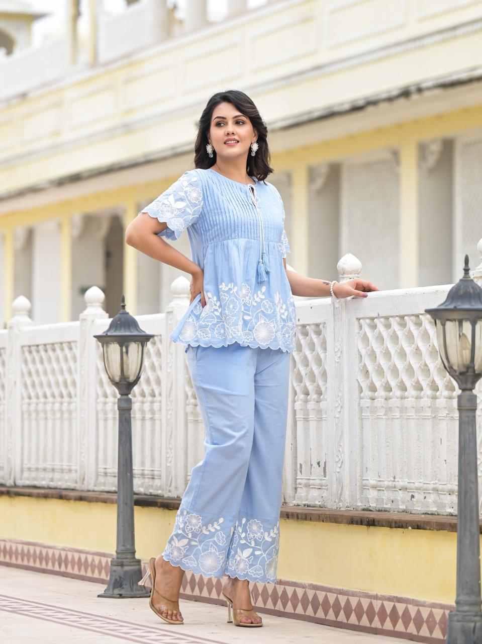 Expertly crafted NOVA CO-ORD SET featuring meticulous embroidery details at the gathered top section and sleeve cuffs. The coordinating bottom piece showcases elegant ankle embroidery, creating a refined and cohesive ensemble.