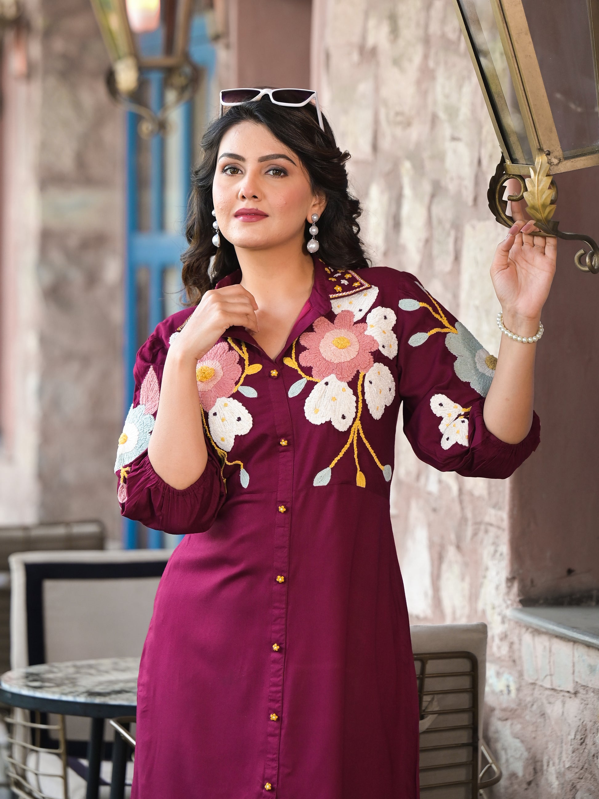 The RANI DRESS features exquisite embroidery detailing that elevates its sophisticated silhouette. Meticulously crafted with precision needlework, this garment exemplifies traditional artisanship while maintaining contemporary appeal for discerning clientele.