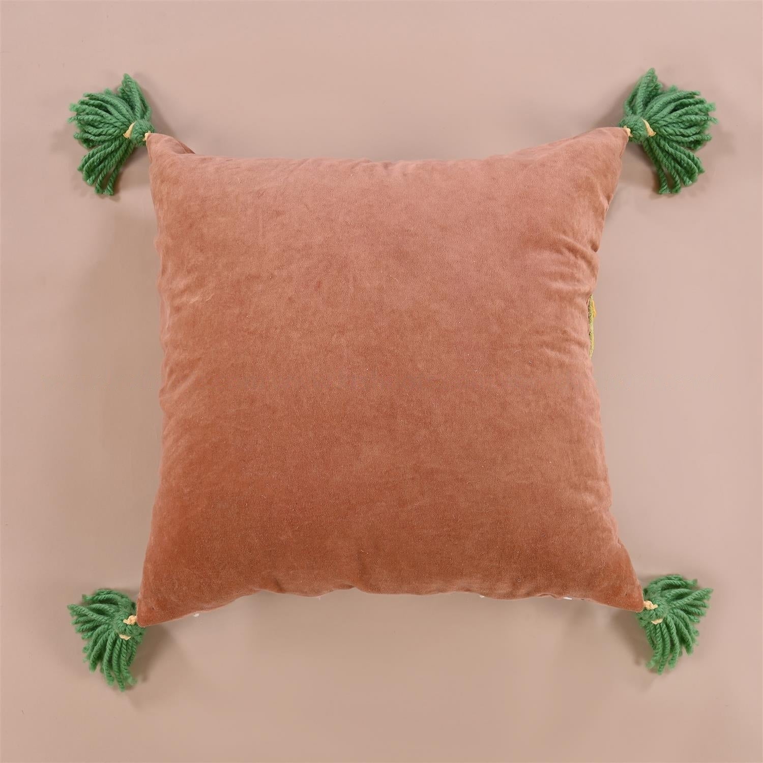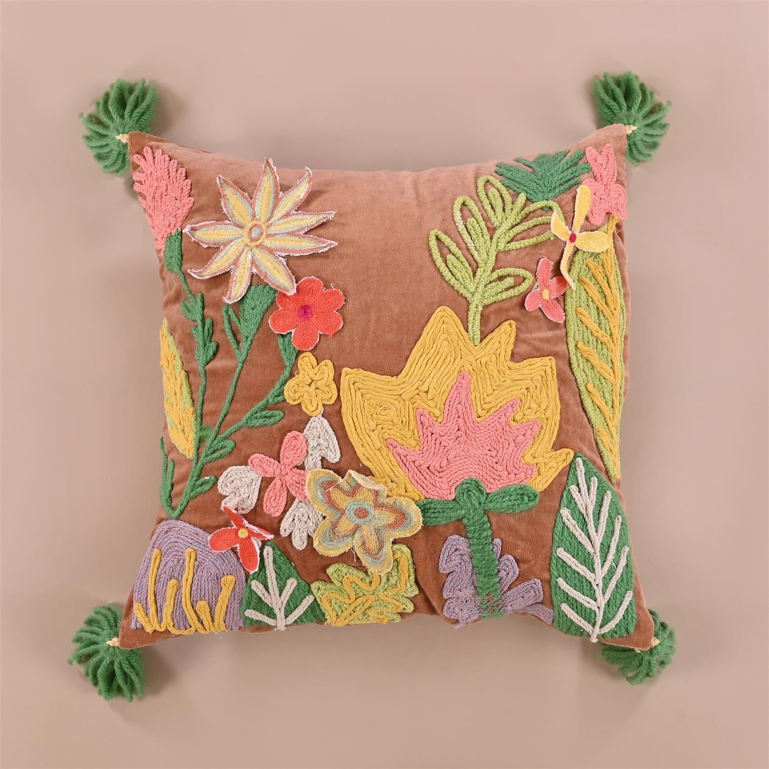 Add a touch of whimsy to your space with this Velvet Embroidered Floral Cushion Cover with green tassels.